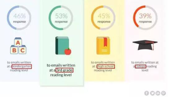 Boomerang公司表示其中,处于三年级水准的电子邮件是最佳的。它比具有大学水准的邮件发出率高36%,回复率高17%。这对于很多标榜自己是“学霸”的人来说,无疑是当头棒喝。当然,此处我们绝对没有谴责当前英语教育的意思,只是在实际的工作沟通过程中,发送邮件时,尝试简化自己的词汇、语句,会收到意想不到的好效果。
