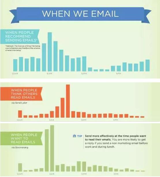 数据表明,一大早或者午餐前发送邮件的回复率高于上午或者下午发送。最好设置在上午6.am.,但此处要注意的是,各国的时间不同,因此需要具体时间具体对待。