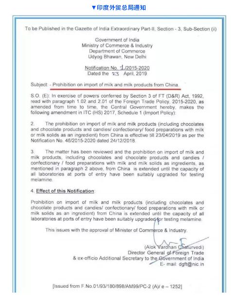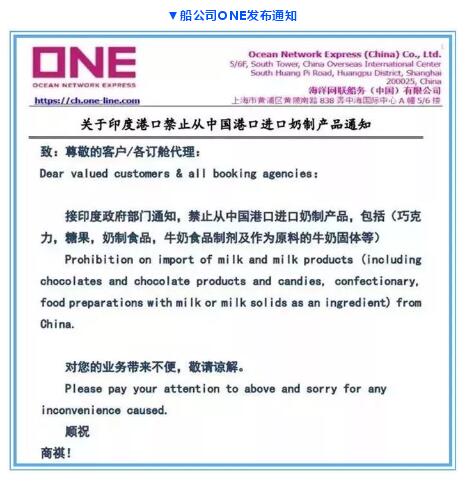 有出口奶制品到印度的外贸企业注意了!近日,印度外贸总局发布通知,禁止从中国出口奶类及奶类制品至印度港口(包括巧克力及奶制食品及糖果及甜点及牛奶食品制剂及作为原料的牛奶固品)。已有船公司发布相关通知,有涉及这类货物出口至印度的货代货主们,具体情况请向相关船公司咨询。