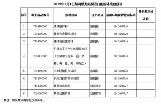 2019年7月1日起,废钢铁、铜废碎料、铝废碎料等新一批8个品种固体废物,将在我国《进口固体废物管理目录》中,从《非限制进口类可用作原料的固体废物目录》调入《限制进口类可用作原料的固体废物目录》。
