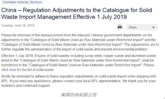 美国总统轮船(APL)6月18日发布公告,提醒客户知悉并遵守中国关于固体废物进口的法规调整。