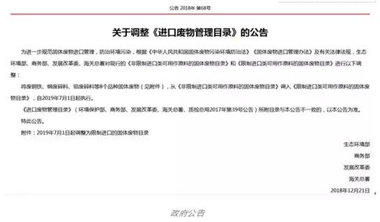 实际上,关于此次调整,2018年年底,生态环境部、商务部、国家发改委、海关总署就联合发布了公告。