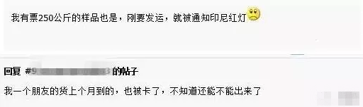 不止一位外贸人反映自己遇到这样的情况,据一位外贸网友反映,他有票250公斤的样品,刚发货就被通知印尼"红灯"。还有货上个月就到了,也被印尼海关卡了,何时放出来,仍然未知的情况。