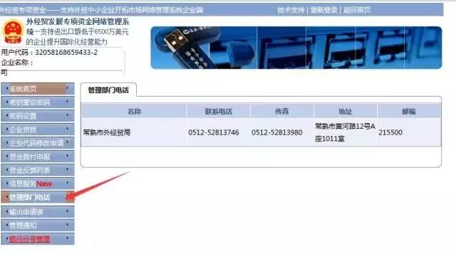 (特 别提醒:A.如果之前已经获得外贸经营者备案登记或进出口经营资格的,暂不必报送书面材料,如果还没有办理则必须到当地商务委员会办理。B.注册完填写了 资料后,第一时间请联系您所在地市的商务局(外经贸局)的资金管理部门并上交相关企业申报材料,进行企业资质审核工作。各地审核时间不一样,请以当地标准 为准。当地商务局的联系方式:以你申请到的账号密码登陆之后就能在首页里按如下红色箭头所示按钮,就能找到你司所在地的商务局联系人信息)