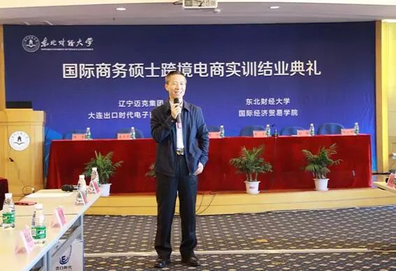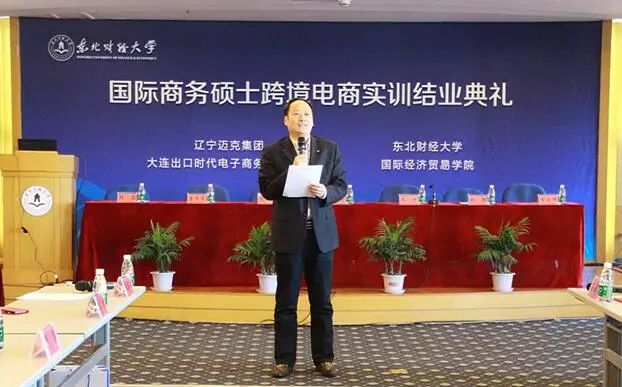 11月22日,迈克集团出口时代与东北财经大学国际经济贸易学院联合举办的“2017年国际商务硕士跨境电商实训结业典礼”在东北财经大学举行。大连市人才服务中心副主任李力、大连市商务局跨境电商处处长陈培志、大连广播电视台著名主持人朱丹、辽宁对外经贸学院国际经 济与贸易研究所所长张颖、东北财经大学国际经济贸易学院党总支书记隋晶、院长姜文学、副院长苏杭、辽宁迈克集团电子商务总监、出口时代CEO徐延峰等相关 部门及学院领导出席了当天的结业典礼。