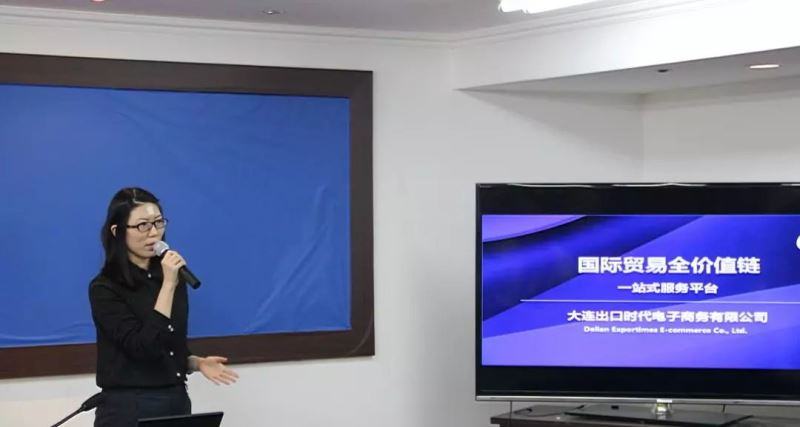 大连出口时代电子商务有限公司公共事务部陈蔚文向参会企业详细介绍了平台提供的国际贸易全价值链的一站式服务,包括外贸综合服务以及海外互联网精准营销服务。