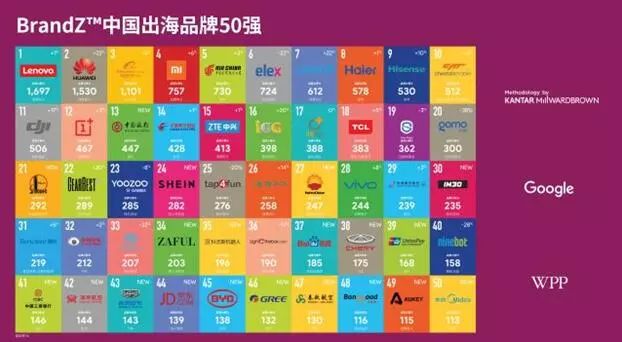 2018年2月6日,全球最大的广告传播集团WPP,协同旗下调研公司凯度华通明略行与 Google 联手发布了2018年「BrandZ™中国出海品牌50强」排行榜单及报告(点击本文末尾“阅读原文”下载报告全文)。随着中国企业在全球的快速扩张,该榜单也从2017年的30个品牌扩充到今年的50个。今年50强榜单的前三名和去年相同,依然为联想、华为和阿里巴巴,其中华为的品牌力指数一年内增长了近22%。在这份报告中,我们骄傲地看到中国品牌在国际市场上不俗的表现及影响力。